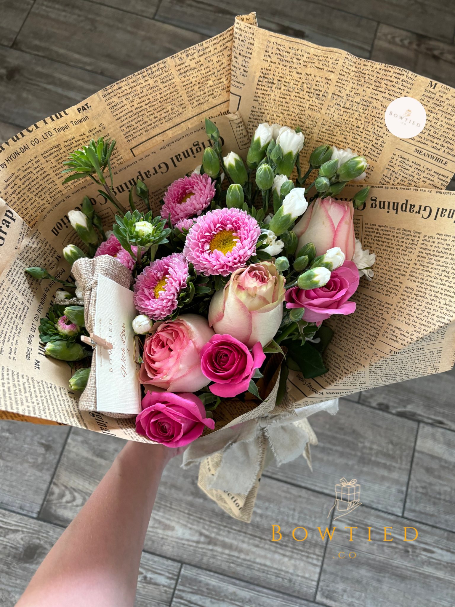 'The Beautiful One' designed to evoke cheer and hope. With hand-selected Pink Roses, White Carnations and Callistephus (affectionately known as Pom Pom Roses) carefully arranged to create a joyous and tranquil display to raise spirits. Finished with our popular recycled news paper wrap and sealed with a simple, rustic bow to complement the dressing.